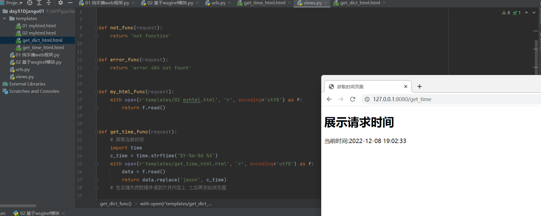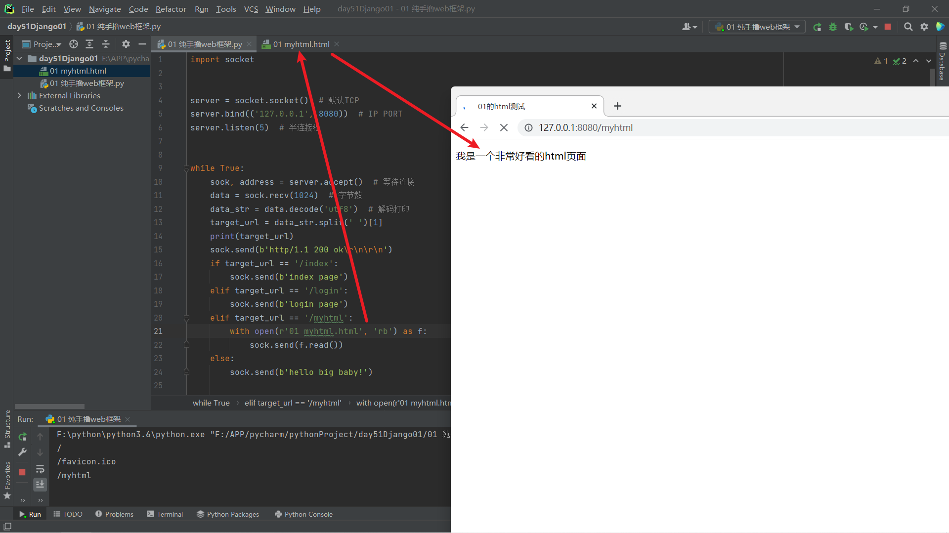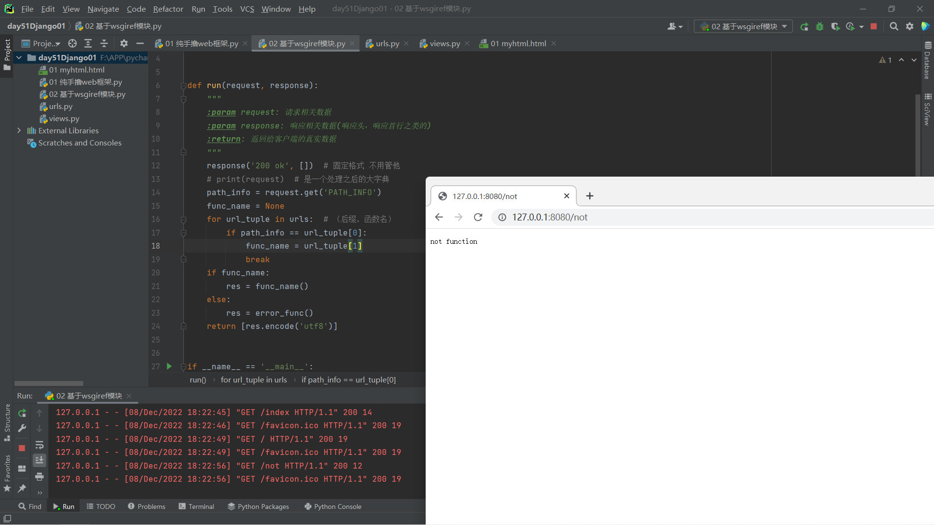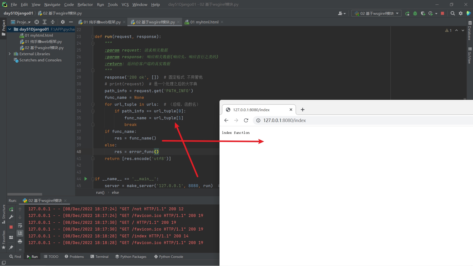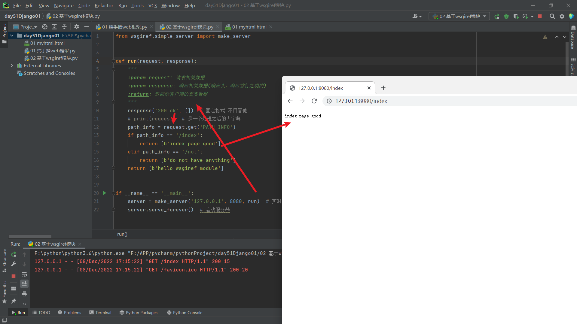 server = make_server('127.0.0.1', 8080, run) # 实时监听127.0.0.1:8080 一旦有请求过来自动给第三个参数加括号并传参数调用