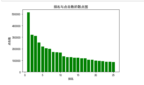 #排名与点击数的条形图 def Tspot(): df = pd.DataFrame(pd.read_excel('爱奇艺排行.xlsx')) x = df.排名 y = df.点击数 plt.xlabel("排名") plt.ylabel("点击数") plt.bar(x,y,color="green") plt.title("排名与点击数的条形图") plt.show() Tspot()