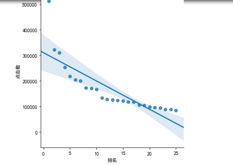 #排名和点击数的线性关系 df = pd.DataFrame(pd.read_excel('爱奇艺排行.xlsx')) sns.lmplot(x="排名",y= "点击数",data=df)