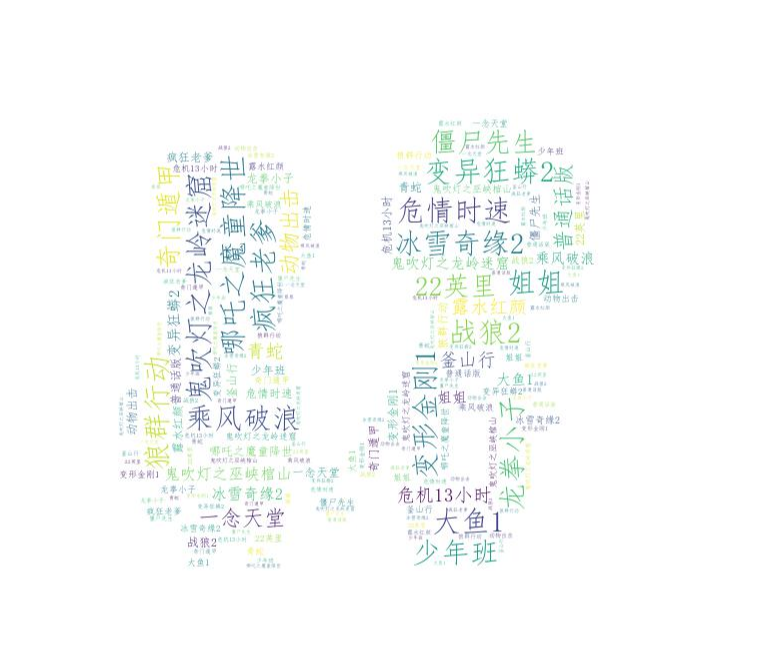 #读取爱奇艺排行.xlsx将其中的电影名写到txt文本中去 Name = pd.read_excel("爱奇艺排行.xlsx", encoding='utf-8') with open("电影名.txt",'a+', encoding='utf-8') as f: for title in Name.电影名: f.write((str(title)+'\n')) #读取电影名.txt文本 text=open('电影名.txt',encoding='utf-8').read() #词云的背景图片 photo=imread('手牵手.jpg') Cyun=WordCloud( background_color = "white", mask = photo, width=1600, repeat=True, font_path=r'simfang.ttf', height=1600).generate(text) plt.imshow(Cyun) plt.axis("off") plt.show() #保存词云图片 Cyun.to_file("爱奇艺词云.jpg")