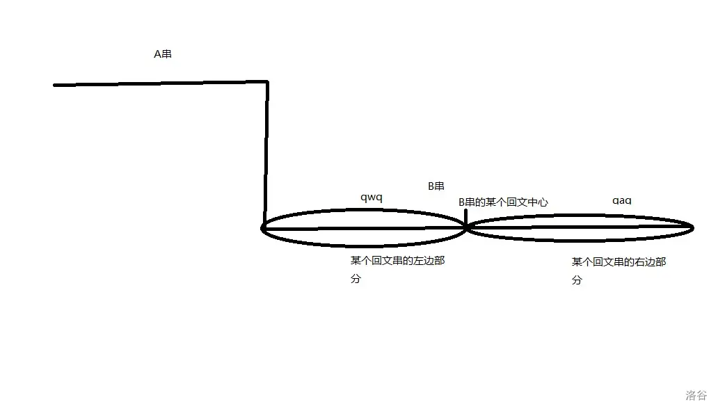 A:在B串中的回文串到头了就该连A了。举个例子,在这幅图中,假设以我画的那个点为回文中心,到 \(\text{qwq}\) 的边界就到头了。这个时候考虑将 \(\text{qwq}\) 向 A 串扩展,而 \(\text{qaq}\) 则向右扩展匹配回文。