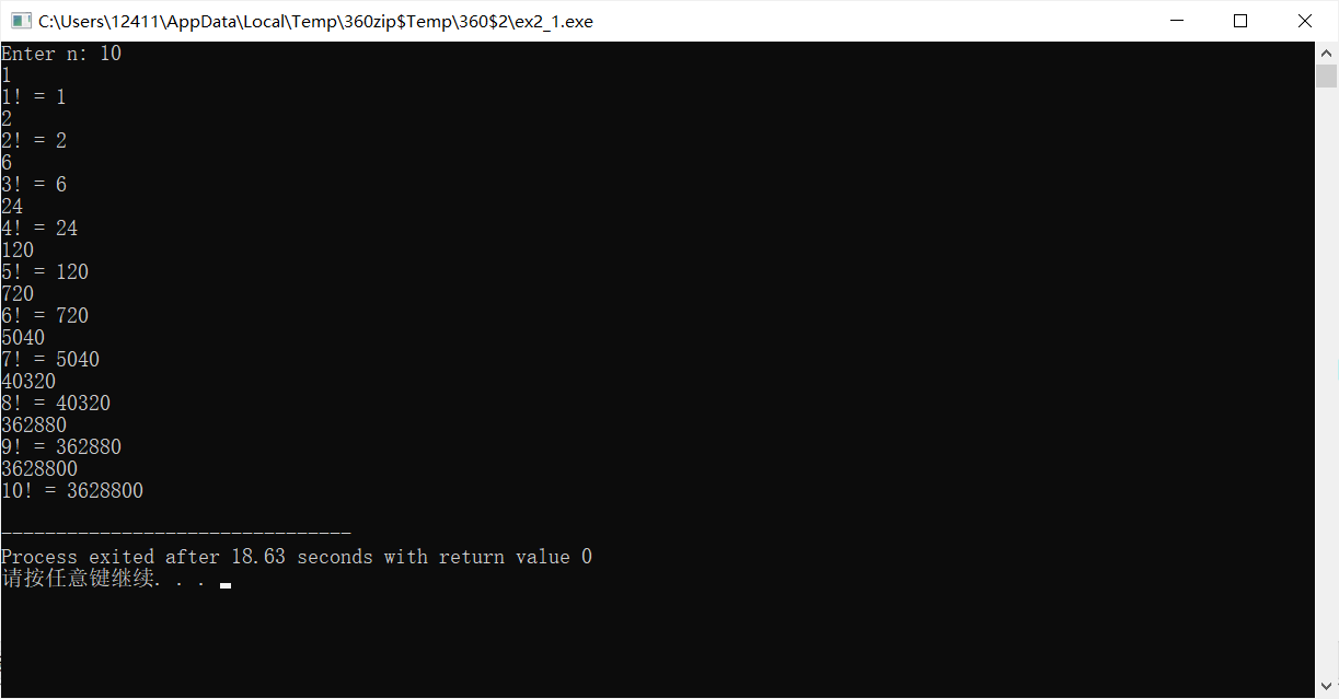 #include <stdio.h> long long fac(int n); int main() { int i,n; printf("Enter n: "); scanf("%d", &n); for(i=1; i<=n; ++i) printf("%d! = %lld\n", i, fac(i)); return 0; } long long fac(int n) { static long long p = 1; p = p*n; return p; } #include <stdio.h> long long fac(int n); int main() { int i,n; printf("Enter n: "); scanf("%d", &n); for(i=1; i<=n; ++i) printf("%d! = %lld\n", i, fac(i)); return 0; } long long fac(int n) { static long long p = 1; p = p*n; printf("%lld\n",p); return p; }