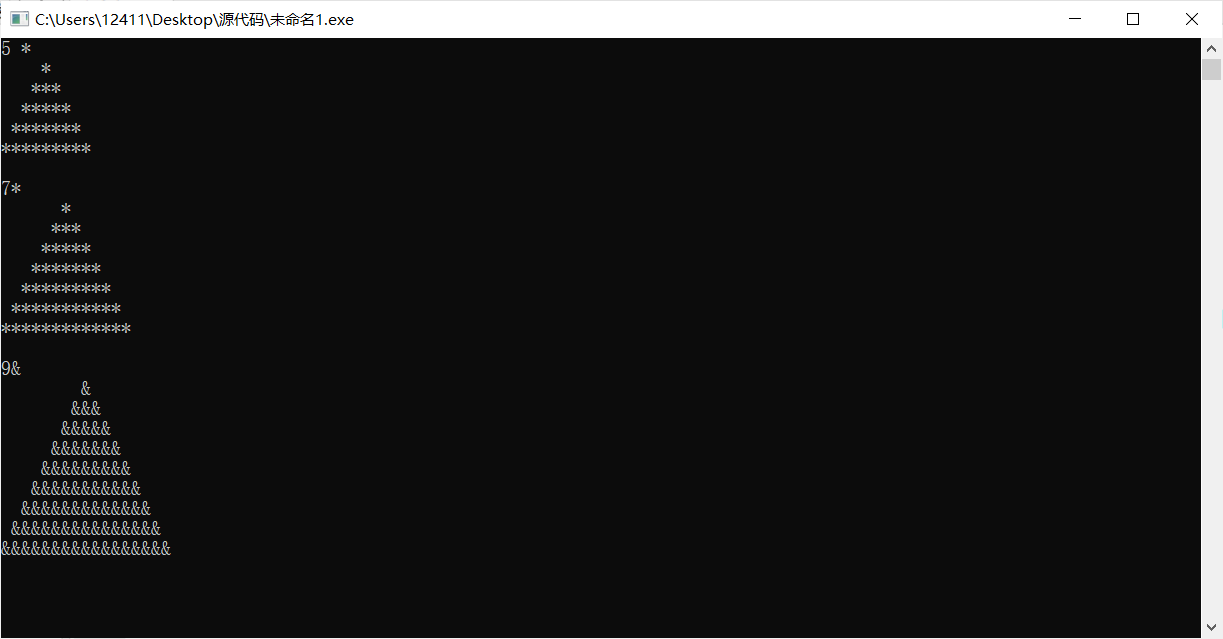 #include <stdio.h> void draw(int n, char symbol); // 函数声明 int main() { int n, symbol; while(scanf("%d %c", &n, &symbol) != EOF) { draw(n, symbol); // 函数调用 printf("\n"); } return 0; } void draw(int n, char symbol) { int i,j,line; for(line=1;line<=n;line++) { for(i=1;i<=n-line;i++) { printf(" "); } for(j=1;j<=2*line-1;j++) { printf("%c",symbol); } printf("\n"); } }