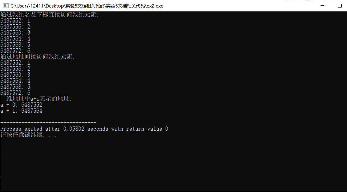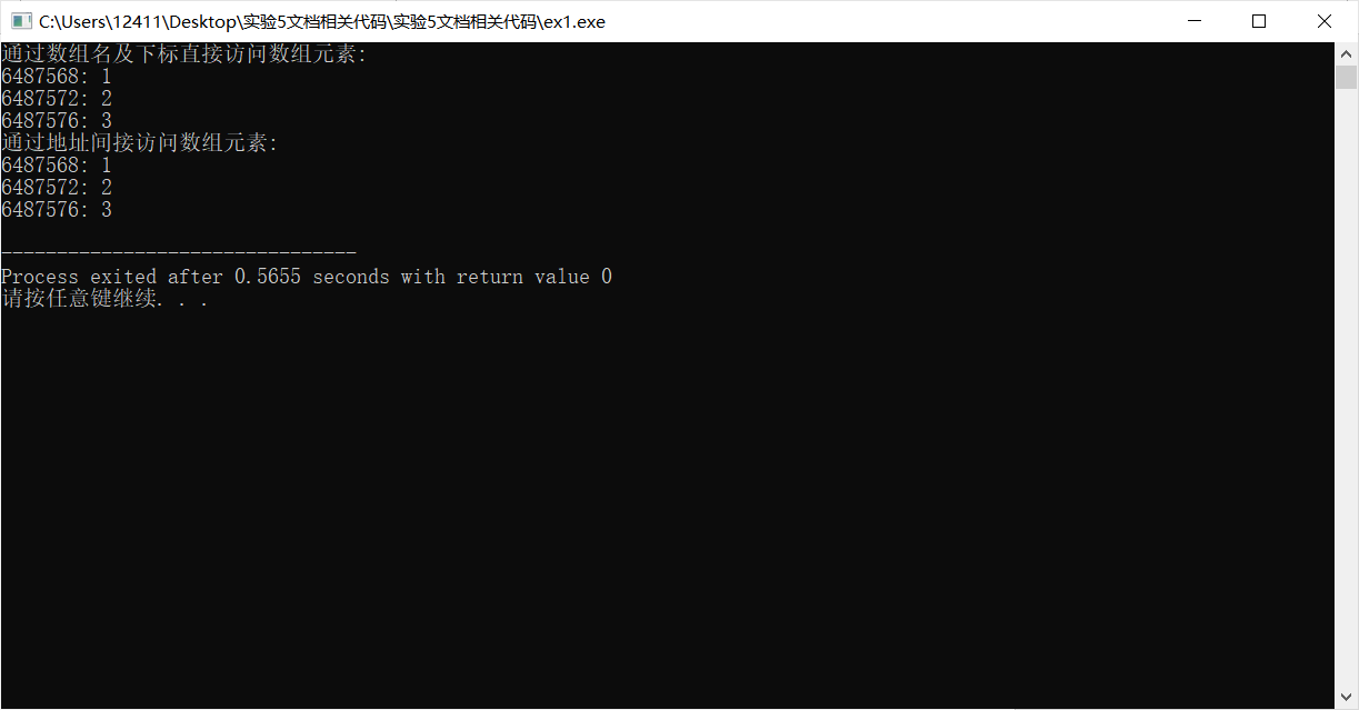 #include <stdio.h> const int N=3; int main() { int a[N] = {1, 2, 3}; int i; printf("通过数组名及下标直接访问数组元素:\n"); for(i=0; i<N; i++) printf("%d: %d\n", &a[i], a[i]); printf("通过地址间接访问数组元素:\n"); for(i=0; i<N; i++) printf("%d: %d\n", a+i, *(a+i)); return 0; }