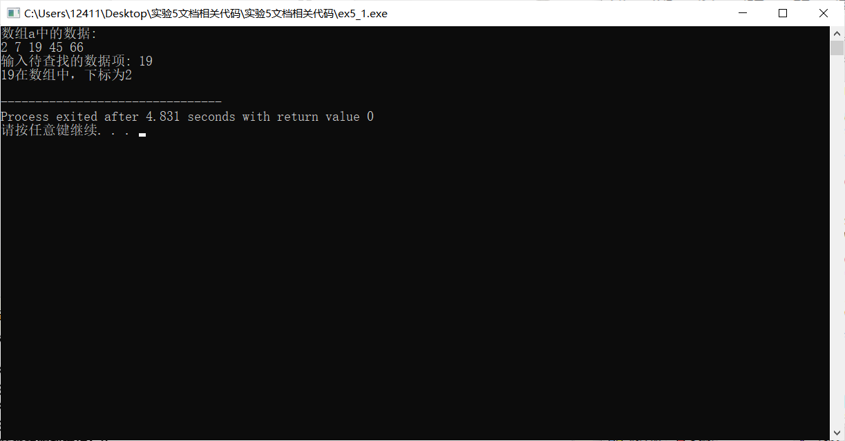 #include <stdio.h> const int N=5; int binarySearch(int *x, int n, int item); int main() { int a[N]={2,7,19,45,66}; int i,index, key; printf("数组a中的数据:\n"); for(i=0;i<N;i++) printf("%d ",a[i]); printf("\n"); printf("输入待查找的数据项: "); scanf("%d", &key); index=binarySearch(a,N,key); if(index>=0) printf("%d在数组中,下标为%d\n", key, index); else printf("%d不在数组中\n", key); return 0; } int binarySearch(int *x, int n, int item) { int low, high, mid; low = 0; high = n-1; while(low <= high) { mid = (low+high)/2; if ( item == *(x+mid) ) mid=-1 ; else if(item < *(x+mid)) high=mid-1; else high=mid+1; } return -1; }