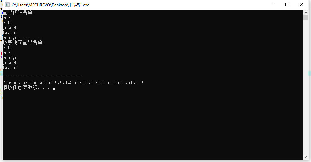 // 练习:使用选择法对字符串按字典序排序 #include <stdio.h> #include <string.h> const int N = 5; void selectSort(char str[][20], int n ); // 函数声明,形参str是二维数组名 int main() { char name[][20] = {"Bob", "Bill", "Joseph", "Taylor", "George"}; int i; printf("输出初始名单:\n"); for(i=0; i<N; i++) printf("%s\n", name[i]); selectSort(name, N); // 调用选择法对name数组中的字符串排序 printf("按字典序输出名单:\n"); for(i=0; i<N; i++) printf("%s\n", name[i]); return 0; } // 函数定义 // 函数功能描述:使用选择法对二维数组str中的n个字符串按字典序排序 void selectSort(char str[][20], int n) { int k,i,j; char temp; for(i=0;i<n-1;i++) k=i; for(j=i;j<n-1;j++){ temp=strcmp(str[j], str[k]); if (temp>0) { k=j; } if(k!=i){ strcpy(temp,str[i]); strcpy(str[i],str[k]); strcpy(str[k],temp); } } }