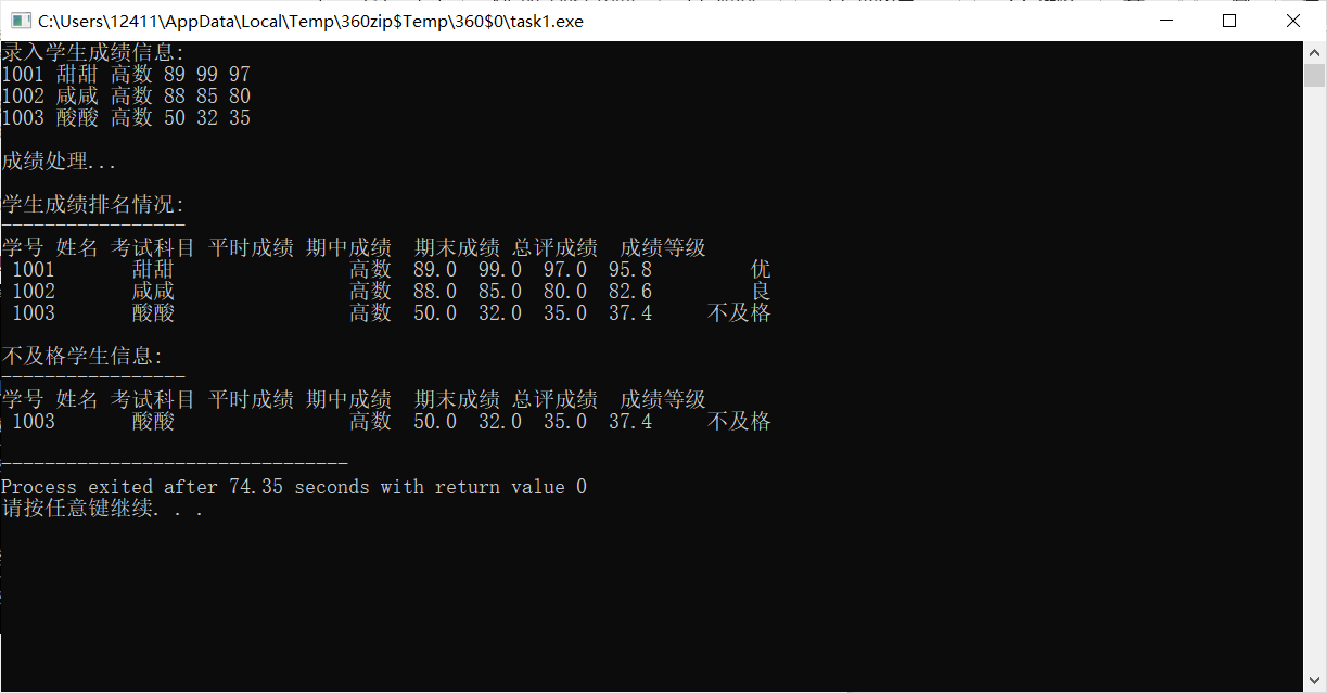 #include<stdio.h> #include<stdlib.h> #include<string.h> #define N 3 typedef struct student { int id; /*学生学号 */ char name[20]; /*学生姓名 */ char subject[20]; /*考试科目 */ float perf; /*平时成绩 */ float mid; /* 期中成绩 */ float final; /* 期末成绩 */ float total; /* 总评成绩 */ char level[10]; /* 成绩等级 */ } STU; void input(STU[],int ); /*输入学生信息 */ void calc(STU[],int); /*计算总评和等级 */ int fail(STU[],STU [],int); /*不及格学生统计 */ void sort(STU[],int); /*排序 */ void print(STU[], int); /*输出学生信息*/ int main() { STU st[N],fst[N]; // 数组st记录学生信息,fst记录不及格学生信息 int k; // 用于记录不及格学生个数 printf("录入学生成绩信息:\n"); input(st,N); printf("\n成绩处理...\n"); calc(st,N); k = fail(st,fst,N); sort(st, N); printf("\n学生成绩排名情况:\n"); print(st, N); printf("\n不及格学生信息:\n"); print(fst, k); return 0; } // 输入学生信息 void input(STU s[],int n) { int i; for(i=0;i<n;i++) scanf("%d %s %s %f %f %f",&s[i].id,s[i].name,s[i].subject,&s[i].perf,&s[i].mid,&s[i].final); } // 计算总评和等级 void calc(STU s[],int n) { int i; for(i=0;i<n;i++) { s[i].total=s[i].perf*0.2+s[i].mid*0.2+s[i].final*0.6; if(s[i].total>=90) strcpy(s[i].level,"优"); // 注意:等级是字符型数组,要使用strcpy完成赋值 else if(s[i].total>=80 && s[i].total<90) strcpy(s[i].level,"良"); else if(s[i].total>=70 && s[i].total<80) strcpy(s[i].level,"中"); else if(s[i].total>=60 && s[i].total<70) strcpy(s[i].level,"及格"); else strcpy(s[i].level,"不及格"); } } // 不及格学生统计 // 数组s存放的是所有学生信息,数组t存放不及格学生信息,n是数组s中元素个数 // 函数返回值:返回的是不及格人数 int fail(STU s[],STU t[],int n) { int i,k=0; for(i=0;i<n;i++) if(s[i].total<60) t[k++]=s[i]; return k; } // 根据总评成绩对学生记录信息排序 // 使用的是冒泡排序算法 void sort(STU s[],int n) { int i,j; STU temp; for(i=0;i<n-1;i++) for(j=0;j<n-1-i;j++) if(s[j].total<s[j+1].total) { temp = s[j]; s[j] = s[j+1]; s[j+1] = temp; } } // 输出学生信息 void print(STU s[], int n) { int i; printf("-----------------\n"); printf("学号 姓名 考试科目 平时成绩 期中成绩 期末成绩 总评成绩 成绩等级\n"); for(i=0;i<n;i++) printf("%5d %10s%20s %5.1f %5.1f %5.1f %5.1f %10s\n",s[i].id,s[i].name,s[i].subject,s[i].perf,s[i].mid,s[i].final,s[i].total,s[i].level); }