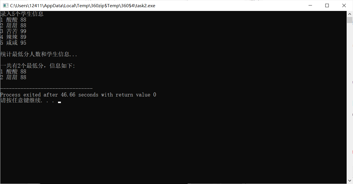 #include <stdio.h> const int N=5; // 定义结构体类型struct student,并定义STU为其别名 typedef struct student { long no; char name[20]; int score; }STU; // 函数声明 void input(STU s[], int n); int findMinlist(STU s[], STU t[], int n); void output(STU s[], int n); int main() { STU stu[N], minlist[N]; int count; printf("录入%d个学生信息\n", N); input(stu, N); printf("\n统计最低分人数和学生信息...\n"); count = findMinlist(stu, minlist, N); printf("\n一共有%d个最低分,信息如下:\n", count); output(minlist, count); return 0; } // 输入n个学生信息,存放在结构体数组s中 void input(STU s[], int n) { int i; for(i=0; i<n; i++) scanf("%ld %s %d", &s[i].no, s[i].name, &s[i].score); } // 输出结构体s中n个元素信息 void output(STU s[], int n) { int i; for(i=0; i<n; i++) printf("%ld %s %d\n", s[i].no, s[i].name, s[i].score); } int findMinlist(STU s[], STU t[], int n) { int i,k=0,min=0; for (i=0;i<n;i++) if(s[i].score<s[min].score) min=i; t[k++]=s[min]; for (i=0;i<n;i++) if(s[i].score==s[min].score&&i!=min) t[k++]=s[i]; return k; }