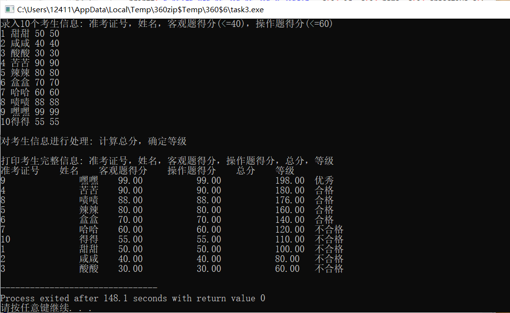 #include <stdio.h> #include <string.h> const int N = 10; // 定义结构体类型struct student,并定义其别名为STU typedef struct student { long int id; char name[20]; float objective; /*客观题得分*/ float subjective; /*操作题得分*/ float sum; char level[10]; }STU; // 函数声明 void input(STU s[], int n); void output(STU s[], int n); void process(STU s[], int n); int main() { STU stu[N]; printf("录入%d个考生信息: 准考证号,姓名,客观题得分(<=40),操作题得分(<=60)\n", N); input(stu, N); printf("\n对考生信息进行处理: 计算总分,确定等级\n"); process(stu, N); printf("\n打印考生完整信息: 准考证号,姓名,客观题得分,操作题得分,总分,等级\n"); output(stu, N); return 0; } // 录入考生信息:准考证号,姓名,客观题得分,操作题得分 void input(STU s[], int n) { int i; for(i=0; i<n; i++) scanf("%ld %s %f %f", &s[i].id, s[i].name, &s[i].objective, &s[i].subjective); } //输出考生完整信息: 准考证号,姓名,客观题得分,操作题得分,总分,等级 void output(STU s[], int n) { int i; printf("准考证号 姓名 客观题得分 操作题得分 总分 等级\n"); for(i=0; i<n; i++) printf("%-16ld%-8s%-16.2f%-16.2f%-8.2f%s\n", s[i].id, s[i].name, s[i].objective,s[i].subjective,s[i].sum,s[i].level); } // 对考生信息进行处理:计算总分,排序,确定等级 void process(STU s[], int n) { int i,max,j; STU temp; for (i=0;i<n;i++) s[i].sum=s[i].objective+s[i].subjective; for (j=0;j<n-1;j++){ max=j; for (i=j;i<n;i++){ if (s[i].sum>s[max].sum) max=i; } if (max!=j){ temp=s[max]; s[max]=s[j]; s[j]=temp; } } for (i=0;i<n;i++){ if (i<=(n/10-1)) strcpy(s[i].level,"优秀"); else if (i>(n/10-1)&&i<=(n/2-1)) strcpy(s[i].level,"合格"); else strcpy(s[i].level,"不合格"); }