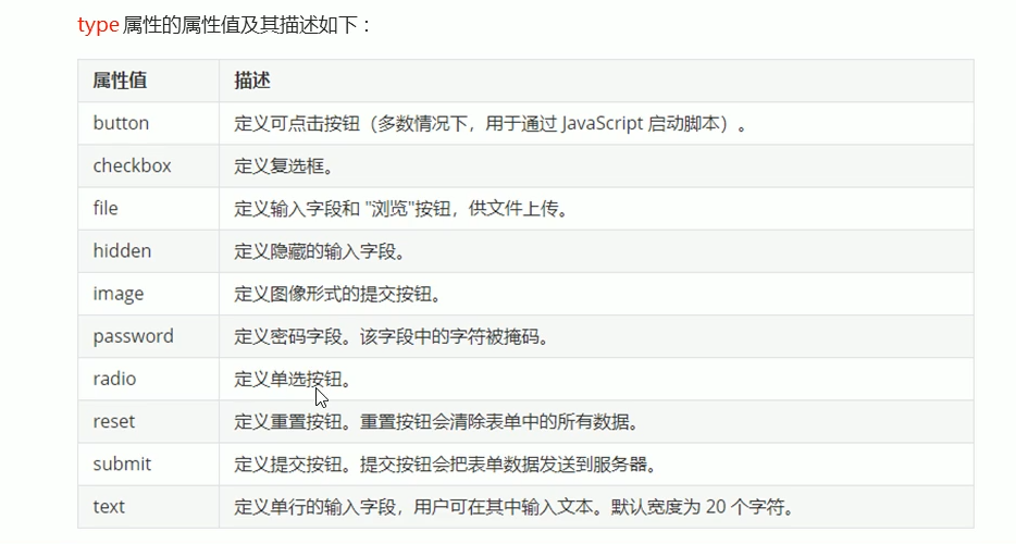 <input>标签包含一个type 属性,根据不同的type属性值,输入字段拥有很多种形式(可以是文本字段,复选框,掩码后的文本控件,单选按钮,按钮等)