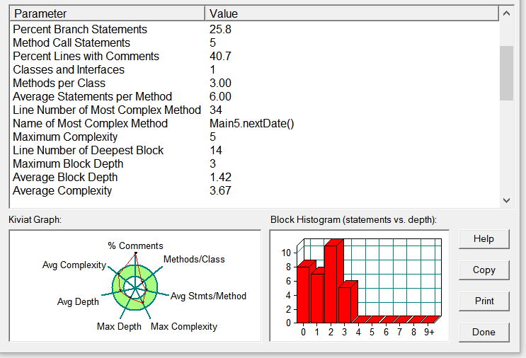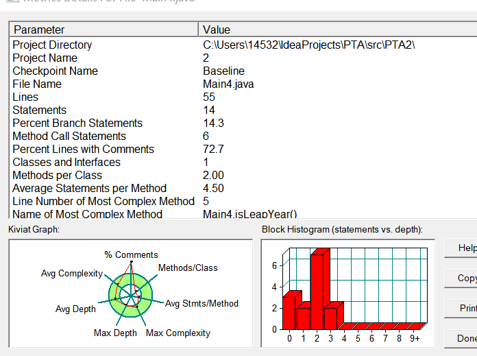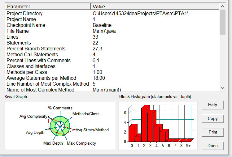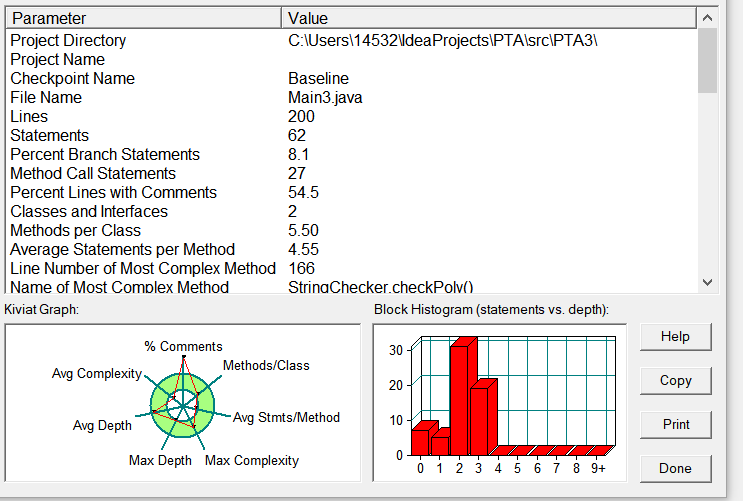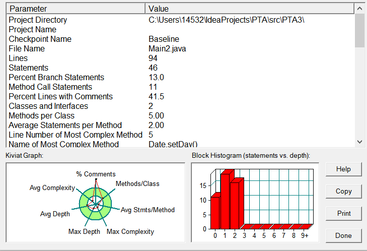 图为源码在SourceMonitor中的分析图。在对类结构设计花了比较多的时间,第一项系数为负和最后一个合法综合性测试没过。整体设计复杂度在合理范围内。