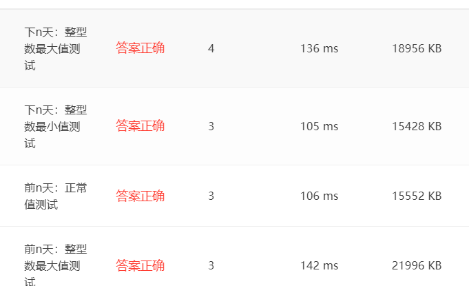 2.在求下n天的整型数最大值测试的测试点花费了较长时间。原因是:如果前一年是闰年,2月天数被置成29,而在后面算法中并没有更改过来,因此造成一个bug,测试了很多的数据才发现该错误,测试源码如下: