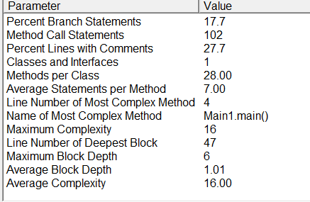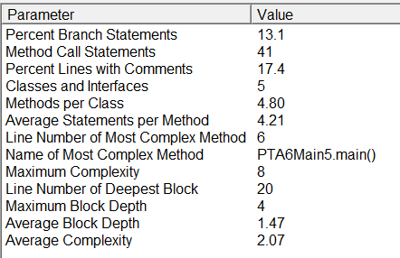 图为题目集5(7-5)源码在SourceMonitor中的分析图: