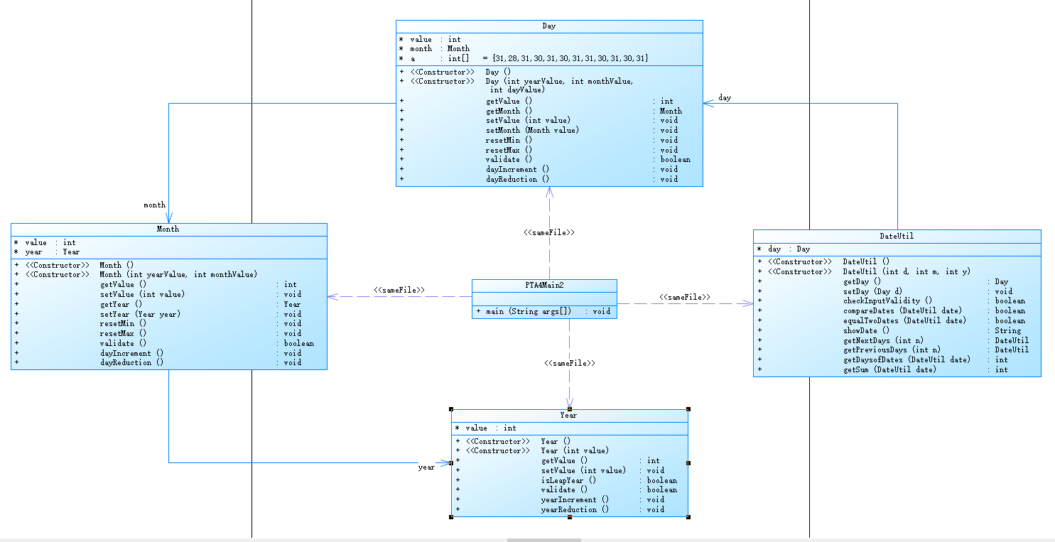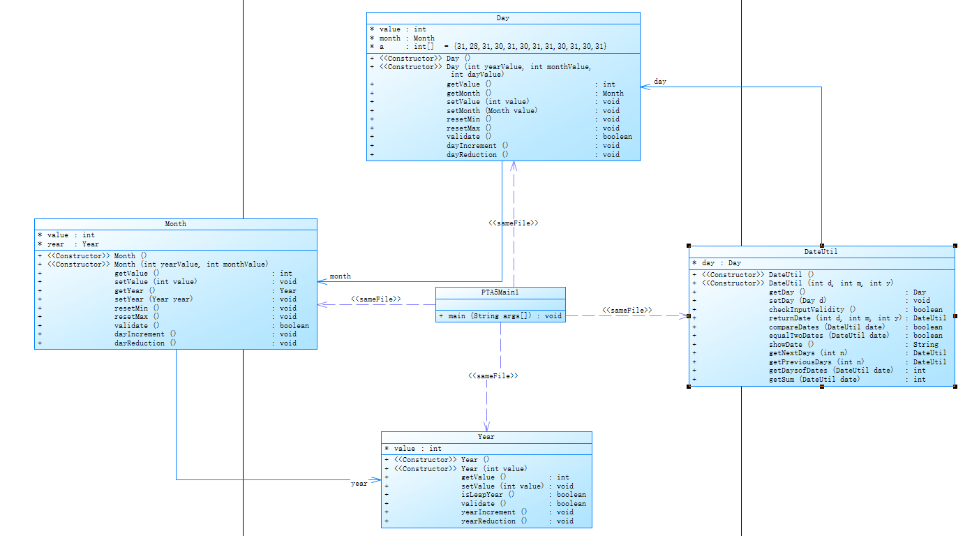 1 //Year类 2 class Year{ 3 int value; 4 //默认构造方法 5 public Year(){ 6 } 7 //带参构造方法 8 public Year(int value){ 9 this.value=value; 10 } 11 //getter 12 public int getValue(){ 13 return value; 14 } 15 //setter 16 public void setValue(int value){ 17 this.value=value; 18 } 19 //判断year是否为闰年 20 public boolean isLeapYear(){ 21 return ((value % 4 == 0 && value % 100 != 0) || value % 400 == 0); 22 } 23 //效验数据合法性 24 public boolean validate(){ 25 return value <= 2020 && value >= 1820; 26 } 27 //年份加一 28 public void yearIncrement(){ 29 value=value+1; 30 } 31 //年份减一 32 public void yearReduction(){ 33 value=value-1; 34 } 35 } 36 //Month类 37 class Month{ 38 int value; 39 Year year; 40 //默认构造方法 41 public Month(){ 42 } 43 //带参构造方法 44 public Month(int yearValue,int monthValue){ 45 this.year=new Year(yearValue); 46 this.value=monthValue; 47 } 48 //value getter 49 public int getValue(){ 50 return value; 51 } 52 // value setter 53 public void setValue(int value){ 54 this.value=value; 55 } 56 //Year getter 57 public Year getYear(){ 58 return year; 59 } 60 //Year setter 61 public void setYear(Year year){ 62 this.year=year; 63 } 64 //日期复位(1) 65 public void resetMin(){ 66 value=1; 67 } 68 //月份设置为12 69 public void resetMax(){ 70 value=12; 71 } 72 //效验数据合法性 73 public boolean validate(){ 74 return value >= 1 && value <= 12; 75 } 76 //月份加一 77 public void dayIncrement(){ 78 value=value+1; 79 } 80 //月份减一 81 public void dayReduction(){ 82 value=value-1; 83 } 84 } 85 //Day类 86 class Day{ 87 int value; 88 Month month; 89 int[] a ={31,28,31,30,31,30,31,31,30,31,30,31}; 90 //默认构造方法 91 public Day(){ 92 } 93 //带参构造方法 94 public Day(int yearValue,int monthValue,int dayValue){ 95 this.month=new Month(yearValue,monthValue); 96 this.value=dayValue; 97 } 98 //getter 99 public int getValue(){ 100 return value; 101 } 102 public Month getMonth(){ 103 return month; 104 } 105 //setter 106 public void setValue(int value){ 107 this.value=value; 108 } 109 public void setMonth(Month value){ 110 this.month=value; 111 } 112 //日期复位(1) 113 public void resetMin(){ 114 value=1; 115 } 116 //日期设为该月最大值 117 public void resetMax(){ 118 value=a[month.getValue()-1]; 119 } 120 //效验数据合法性 121 public boolean validate(){ 122 if(this.getMonth().getYear().isLeapYear()) 123 a[1]=29; 124 if(this.getMonth().validate()) { 125 return value >= 1 && value <= a[month.getValue() - 1]; 126 } 127 else{ 128 return false; 129 } 130 } 131 //日期加一 132 public void dayIncrement() { 133 value=value+1; 134 } 135 //日期减一 136 public void dayReduction() { 137 value=value-1; 138 } 139 }