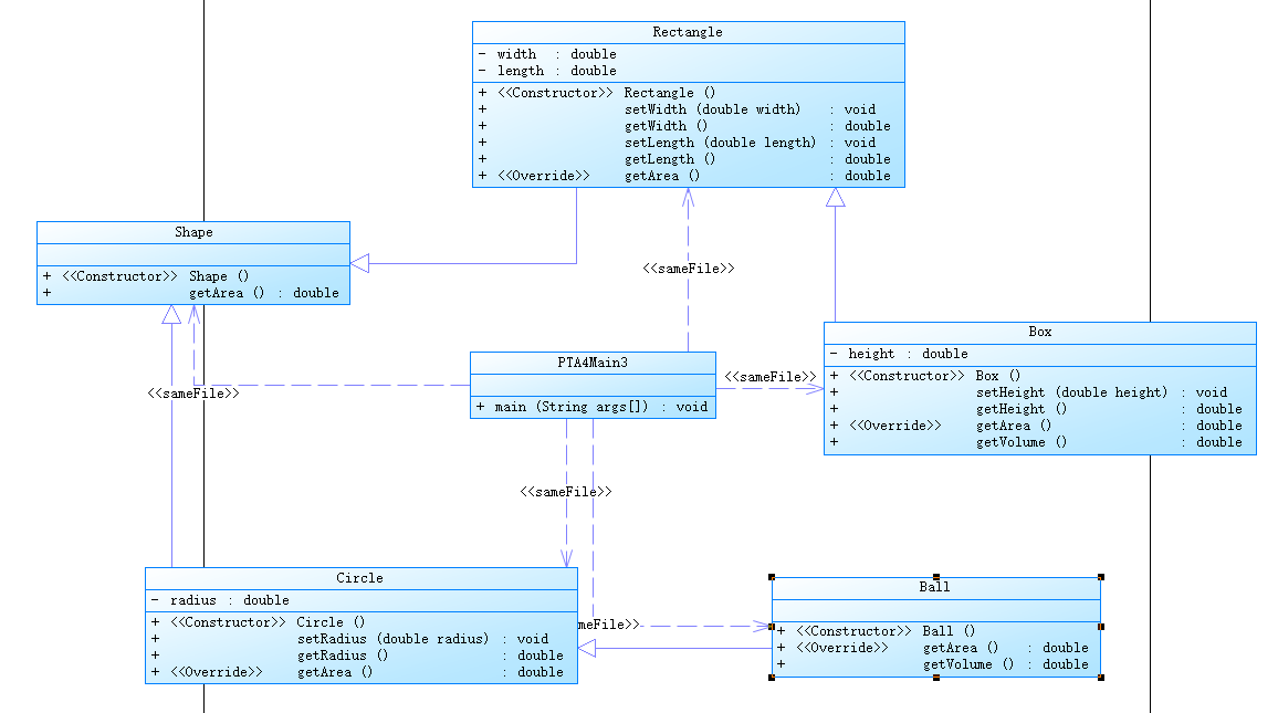 1 package PTA4; 2 import java.util.Scanner; 3 4 public class Main3 { 5 public static void main(String[] args){ 6 Scanner input = new Scanner(System.in); 7 int option = input.nextInt(); 8 if(option == 1){ //圆 9 double circle = input.nextDouble(); 10 if(circle >= 0) { 11 Circle c = new Circle(); 12 c.setRadius(circle); 13 System.out.printf("Circle's area:%.2f", c.getArea()); 14 } 15 else{ 16 System.out.print("Wrong Format"); 17 } 18 System.exit(0); 19 } 20 else if(option == 2){ //矩形 21 double width = input.nextDouble(); 22 double length = input.nextDouble(); 23 if(width>=0 && length>=0) { 24 Rectangle r = new Rectangle(); 25 r.setWidth(width); 26 r.setLength(length); 27 System.out.printf("Rectangle's area:%.2f",r.getArea()); 28 } 29 else{ 30 System.out.print("Wrong Format"); 31 } 32 System.exit(0); 33 } 34 else { 35 if(option == 3){ //球 36 double circle = input.nextDouble(); 37 if(circle>=0) { 38 Ball b = new Ball(); 39 b.setRadius(circle); 40 System.out.printf("Ball's surface area:%.2f\n",b.getArea()); 41 System.out.printf("Ball's volume:%.2f",b.getVolume()); 42 } 43 else{ 44 System.out.print("Wrong Format"); 45 } 46 } 47 else { 48 if(option == 4){ //立方体 49 double width = input.nextDouble() ; 50 double length = input.nextDouble() ; 51 double height = input.nextDouble(); 52 if(length>=0 && width>=0 && height>=0) { 53 Box box = new Box(); 54 box.setWidth(width); 55 box.setLength(length); 56 box.setHeight(height); 57 System.out.printf("Box's surface area:%.2f\n",box.getArea()); 58 System.out.printf("Box's volume:%.2f",box.getVolume()); 59 } 60 else{ 61 System.out.print("Wrong Format"); 62 } 63 } 64 else{ 65 System.out.print("Wrong Format"); 66 } 67 } 68 System.exit(0); 69 } 70 } 71 } 72 //图形面积类 73 class Shape{ 74 public Shape(){ //无参构造 75 System.out.println("Constructing Shape"); 76 } 77 public double getArea(){ 78 return 0.0; 79 } 80 } 81 //圆面积类 82 class Circle extends Shape{ 83 private double radius; 84 //构造方法 85 public Circle() { 86 System.out.println("Constructing Circle"); 87 } 88 //setter 89 public void setRadius(double radius){ 90 this.radius = radius; 91 } 92 //getter 93 public double getRadius() { 94 return radius; 95 } 96 //计算面积 97 public double getArea(){ 98 return Math.PI*radius*radius; 99 } 100 } 101 //矩形面积类 102 class Rectangle extends Shape{ 103 private double width; 104 private double length; 105 //构造方法 106 public Rectangle(){ 107 System.out.println("Constructing Rectangle"); 108 } 109 // width setter 110 public void setWidth(double width){ 111 this.width = width; 112 } 113 //width getter 114 public double getWidth(){ 115 return width; 116 } 117 //length setter 118 public void setLength(double length){ 119 this.length = length; 120 } 121 //width getter 122 public double getLength(){ 123 return length; 124 } 125 //计算面积 126 public double getArea(){ 127 return length*width; 128 } 129 } 130 //球体积类 131 class Ball extends Circle{ 132 //构造方法 133 public Ball(){ 134 System.out.println("Constructing Ball"); 135 } 136 //求球的表面积 137 public double getArea(){ 138 return 4*Math.PI*super.getRadius()*super.getRadius(); 139 } 140 //求球的体积 141 public double getVolume(){ 142 return 4*Math.PI*super.getRadius()*super.getRadius()*super.getRadius()/3; 143 } 144 } 145 //立方体体积类 146 class Box extends Rectangle{ 147 private double height; 148 //构造方法 149 public Box(){ 150 System.out.println("Constructing Box"); 151 } 152 //setter 153 public void setHeight(double height){ 154 this.height = height; 155 } 156 //getter 157 public double getHeight(){ 158 return height; 159 } 160 //求立方体的表面积 161 public double getArea(){ 162 return 2*(super.getLength()*super.getWidth() + super.getLength()*height + super.getWidth()*height); 163 } 164 //求立方体的体积 165 public double getVolume(){ 166 return super.getLength()*super.getWidth()*height; 167 } 168 }