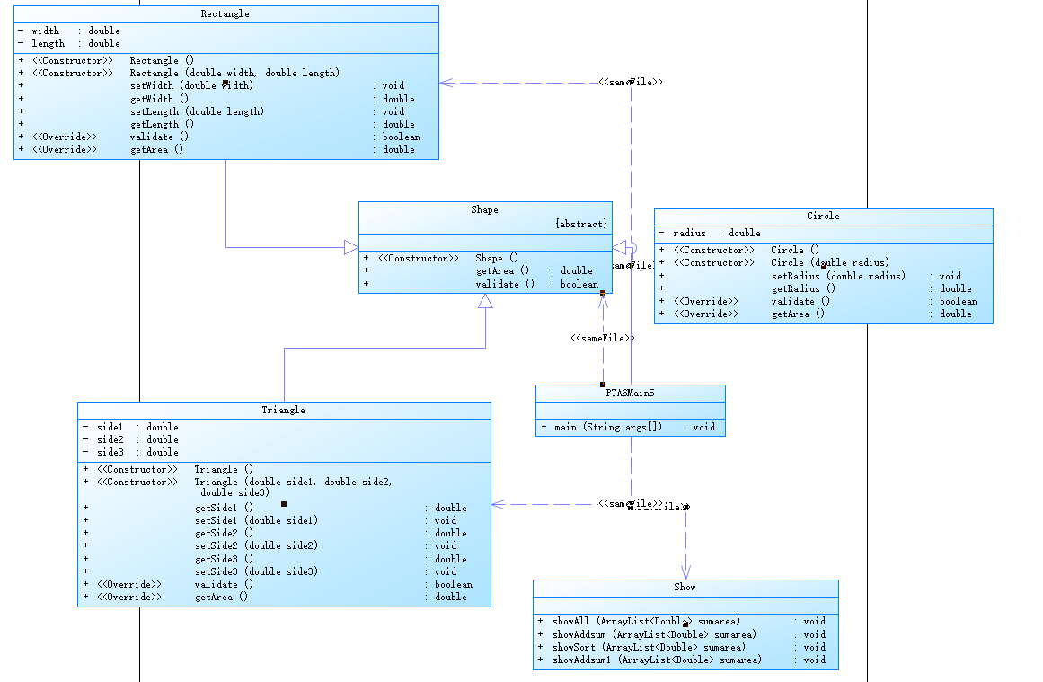 1 package PTA6; 2 import java.util.ArrayList; 3 import java.util.Collections; 4 import java.util.Scanner; 5 public class Main5{ 6 public static void main(String[] args) { 7 ArrayList<Double> sumarea = new ArrayList<>(); //面积表 8 Scanner input = new Scanner(System.in); 9 int m = input.nextInt(); //m表示圆的数量 10 int n = input.nextInt(); //n表示长方形的数量 11 int p = input.nextInt(); //t表示三角形的数量 12 // int p = m+2*n+3*t; //一共要输入的边长,按顺序存入数组中 13 if(m>=0 && n>=0 && p>=0) { //数量输入合法 14 Circle c[] = new Circle[m]; 15 Rectangle r[] = new Rectangle[n]; 16 Triangle t[] = new Triangle[p]; 17 18 //圆面积 19 for (int i = 0; i < m; i++) { 20 c[i] = new Circle(input.nextDouble()); 21 if (!c[i].validate()) { 22 System.out.print("Wrong Format"); 23 System.exit(0); 24 } 25 sumarea.add(c[i].getArea()); 26 } 27 //矩形面积 28 for(int j = 0; j < n; j++){ 29 r[j] = new Rectangle(input.nextDouble(), input.nextDouble()); 30 if(!r[j].validate()){ 31 System.out.print("Wrong Format"); 32 System.exit(0); 33 } 34 sumarea.add(r[j].getArea()); 35 } 36 //三角形面积 37 for(int k = 0; k < p; k++){ 38 t[k] = new Triangle(input.nextDouble(), input.nextDouble(), input.nextDouble()); 39 if(!t[k].validate()){ 40 System.out.print("Wrong Format"); 41 System.exit(0); 42 } 43 sumarea.add(t[k].getArea()); 44 } 45 Show show = new Show(); 46 show.showAll(sumarea); 47 show.showAddsum(sumarea); 48 show.showSort(sumarea); 49 show.showAddsum1(sumarea); 50 } 51 else{ 52 System.out.print("Wrong Format"); 53 } 54 } 55 } 56 //图形父类 57 abstract class Shape{ 58 public Shape(){ //无参构造 59 } 60 public double getArea(){ 61 return 0.0; 62 } 63 public boolean validate(){ 64 return true; 65 } 66 } 67 class Show{ 68 //输出表中面积 69 public void showAll(ArrayList<Double> sumarea){ 70 System.out.println("Original area:"); 71 for(double i: sumarea){ 72 System.out.printf("%.2f ",i); 73 } 74 System.out.println(); 75 } 76 //对面积求和 77 public void showAddsum(ArrayList<Double> sumarea){ 78 System.out.print("Sum of area:"); 79 double sum = 0; 80 for(double i: sumarea){ 81 sum +=i; 82 } 83 System.out.printf("%.2f",sum); 84 System.out.println(); 85 } 86 //对面积排序 87 public void showSort(ArrayList<Double> sumarea){ 88 System.out.println("Sorted area:"); 89 Collections.sort(sumarea); 90 for(double i: sumarea){ 91 System.out.printf("%.2f ",i); 92 } 93 System.out.println(); 94 } 95 //对面积求和 96 public void showAddsum1(ArrayList<Double> sumarea){ 97 System.out.print("Sum of area:"); 98 double sum = 0; 99 for(double i: sumarea){ 100 sum +=i; 101 } 102 System.out.printf("%.2f",sum); 103 } 104 } 105 //圆面积类 106 class Circle extends Shape { 107 private double radius; 108 //无参构造方法 109 public Circle() { 110 } 111 //带参构造方法 112 public Circle(double radius){ 113 this.radius = radius; 114 } 115 //setter 116 public void setRadius(double radius){ 117 this.radius = radius; 118 } 119 //getter 120 public double getRadius() { 121 return radius; 122 } 123 //判断是否合法 124 @Override 125 public boolean validate(){ 126 if(radius > 0) 127 return true; 128 else 129 return false; 130 } 131 //计算面积 132 @Override 133 public double getArea(){ 134 return Math.PI*radius*radius; 135 } 136 } 137 //矩形面积类 138 class Rectangle extends Shape { 139 private double width; 140 private double length; 141 //构造方法 142 public Rectangle(){ 143 } 144 //带参构造函数 145 public Rectangle(double width, double length){ 146 this.width = width; 147 this.length = length; 148 } 149 // width setter 150 public void setWidth(double width){ 151 this.width = width; 152 } 153 //width getter 154 public double getWidth(){ 155 return width; 156 } 157 //length setter 158 public void setLength(double length){ 159 this.length = length; 160 } 161 //width getter 162 public double getLength(){ 163 return length; 164 } 165 //判断是否合法 166 @Override 167 public boolean validate(){ 168 if(width>0 && length>0) 169 return true; 170 else 171 return false; 172 } 173 //计算面积 174 @Override 175 public double getArea(){ 176 return length*width; 177 } 178 } 179 //三角形面积类 180 class Triangle extends Shape{ 181 private double side1; 182 private double side2; 183 private double side3; 184 public Triangle(){ //无参构造 185 } 186 //带参构造 187 public Triangle(double side1, double side2, double side3){ 188 this.side1 = side1; 189 this.side2 = side2; 190 this.side3 = side3; 191 } 192 //side1 getter 193 public double getSide1() { 194 return side1; 195 } 196 //side1 setter 197 public void setSide1(double side1){ 198 this.side1 = side1; 199 } 200 //side2 getter 201 public double getSide2() { 202 return side2; 203 } 204 //side2 setter 205 public void setSide2(double side2) { 206 this.side2 = side2; 207 } 208 //side3 getter 209 public double getSide3() { 210 return side3; 211 } 212 //side3 setter 213 public void setSide3(double side3) { 214 this.side3 = side3; 215 } 216 //判断是否合法,三边大于零且任意两边之和大于第三边 217 @Override 218 public boolean validate(){ 219 if(side1<side2){ 220 double temp = side1; 221 side1 = side2; 222 side2 = temp; 223 } 224 if(side1<side3){ 225 double temp = side1; 226 side1 = side3; 227 side3 = temp; 228 } 229 if(side1>0&&side2>0&&side3>0&&(side2+side3)>side1) 230 return true; 231 else 232 return false; 233 } 234 //计算面积(海伦公式) 235 @Override 236 public double getArea(){ 237 double p = (side1+side2+side3)/2; 238 return Math.sqrt(p*(p-side1)*(p-side2)*(p-side3)); 239 } 240 241 }