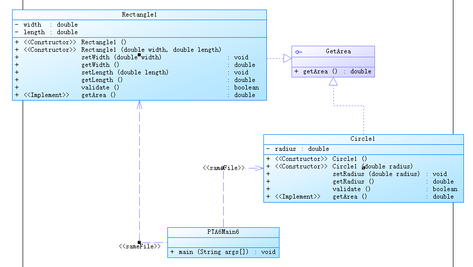1 package PTA6; 2 import java.util.Scanner; 3 public class Main6 { 4 public static void main(String[] args){ 5 Scanner input = new Scanner(System.in); 6 double radius = input.nextDouble(); //输入圆半径 7 double width = input.nextDouble(); //输入宽 8 double length = input.nextDouble(); //输入高 9 Circle1 c = new Circle1(radius); 10 Rectangle1 r = new Rectangle1(width,length); 11 if(c.validate()&&r.validate()) { //输入合法 12 GetArea m = new Circle1(radius); 13 System.out.printf("%.2f",m.getArea()); 14 System.out.println(); 15 GetArea n = new Rectangle1(width,length); 16 System.out.printf("%.2f",n.getArea()); 17 } 18 else{ 19 System.out.print("Wrong Format"); 20 } 21 } 22 } 23 //圆面积类 24 class Circle1 implements GetArea{ 25 private double radius; 26 //无参构造方法 27 public Circle1() { 28 } 29 //带参构造方法 30 public Circle1(double radius){ 31 this.radius = radius; 32 } 33 //setter 34 public void setRadius(double radius){ 35 this.radius = radius; 36 } 37 //getter 38 public double getRadius() { 39 return radius; 40 } 41 //判断是否合法 42 public boolean validate(){ 43 if(radius > 0) 44 return true; 45 else 46 return false; 47 } 48 //计算面积 49 public double getArea(){ 50 return Math.PI*radius*radius; 51 } 52 } 53 //矩形面积类 54 class Rectangle1 implements GetArea{ 55 private double width; 56 private double length; 57 //构造方法 58 public Rectangle1(){ 59 } 60 //带参构造函数 61 public Rectangle1(double width, double length){ 62 this.width = width; 63 this.length = length; 64 } 65 // width setter 66 public void setWidth(double width){ 67 this.width = width; 68 } 69 //width getter 70 public double getWidth(){ 71 return width; 72 } 73 //length setter 74 public void setLength(double length){ 75 this.length = length; 76 } 77 //width getter 78 public double getLength(){ 79 return length; 80 } 81 //判断是否合法 82 public boolean validate(){ 83 if(width>0 && length>0) 84 return true; 85 else 86 return false; 87 } 88 //计算面积 89 public double getArea(){ 90 return length*width; 91 } 92 } 93 //面积接口类 94 interface GetArea { 95 public abstract double getArea(); 96 }