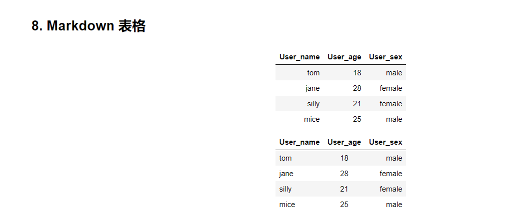 - Markdown 制作表格使用 | 来分隔不同的单元格,使用 - 来分隔表头和其他行