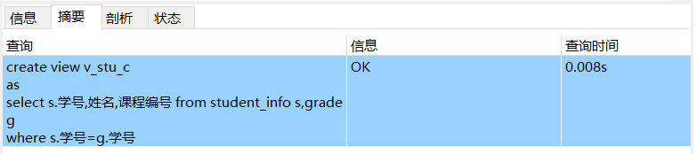 8. 基于student_info表、curriculum表和grade表,建立一个名为v_stu_g的视图,视图包括所有学生的学号、姓名、课程名称、分数。使用视图v_stu_g查询学号为0001的学生的课程平均分。