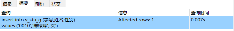 10.利用视图v_stu_g为student_info表添加一行数据:学号为0010、姓名为陈婷婷、性别为女。