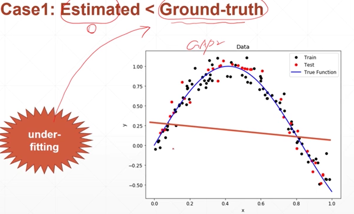 所使用的模型的复杂度<实际真实的模型的复杂度——欠拟合(ax+b<a(bx+c)+d)