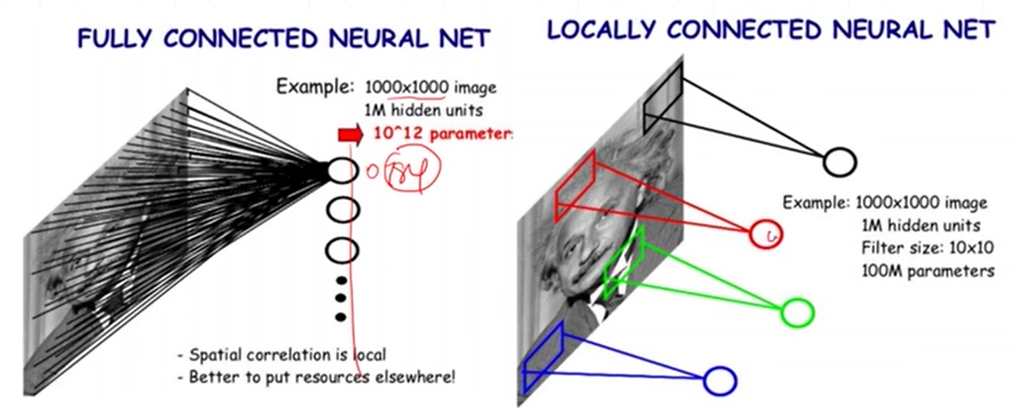 由于神经网络中的点一多,线就会特别多,引起硬件需求变高。此时提出了局部相关性(卷积),只使用上一部分的某几个通过权值到达下一层的一个节点,减少线