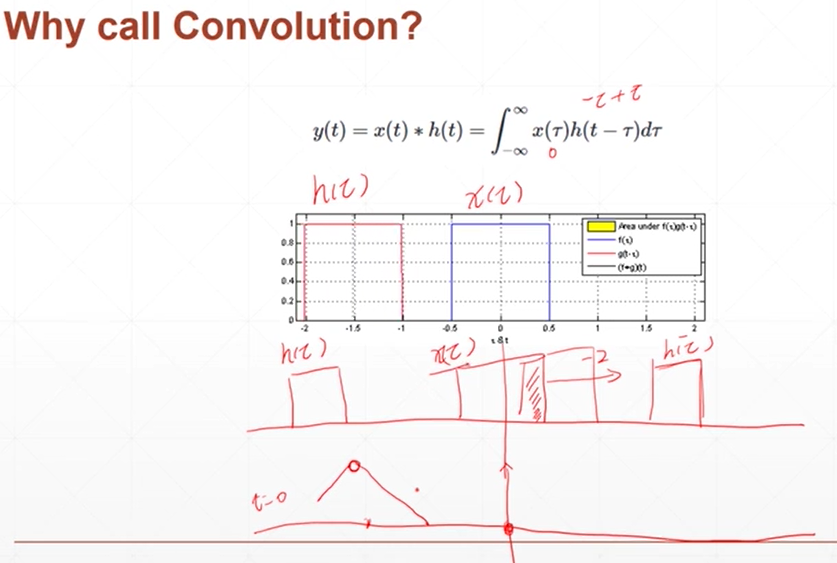 红色的是h(t),蓝色的是x(t),卷积代表的是在h(t)移动的过程中与x(t)的重合量,重合的多重叠时达到最大。