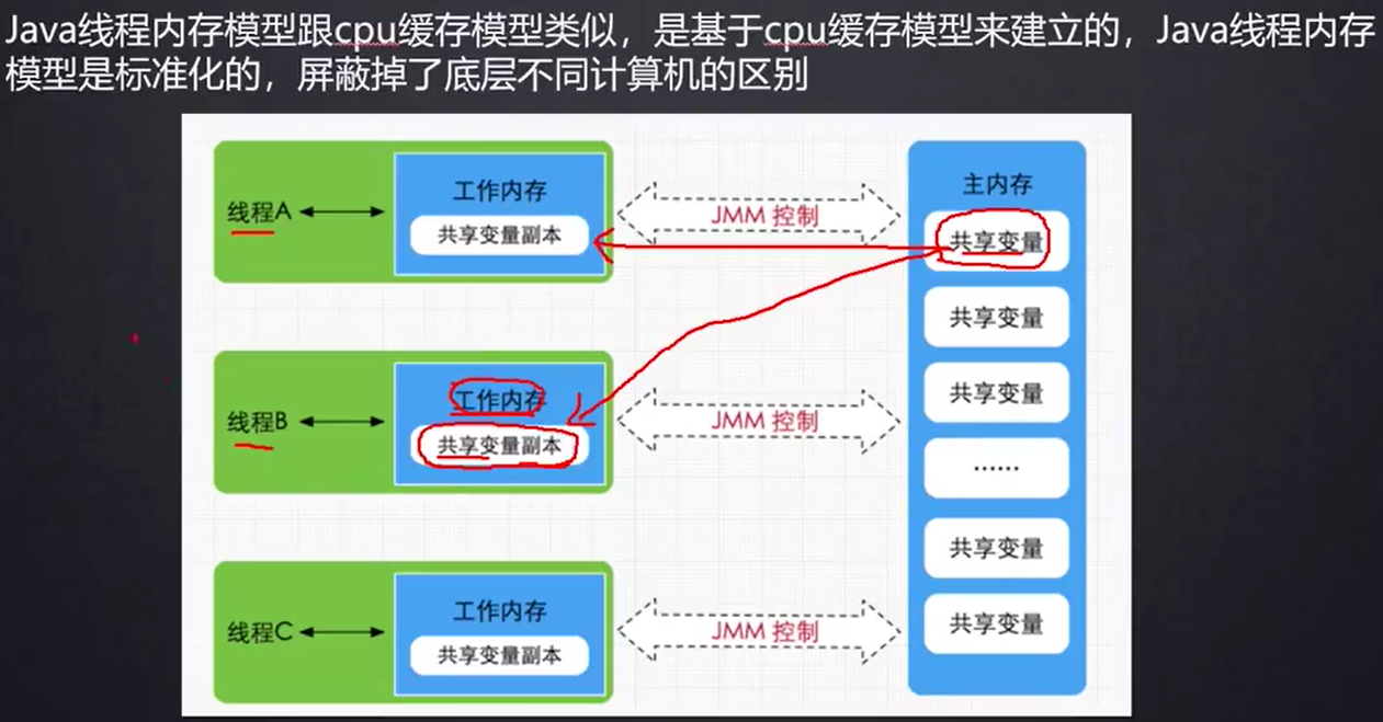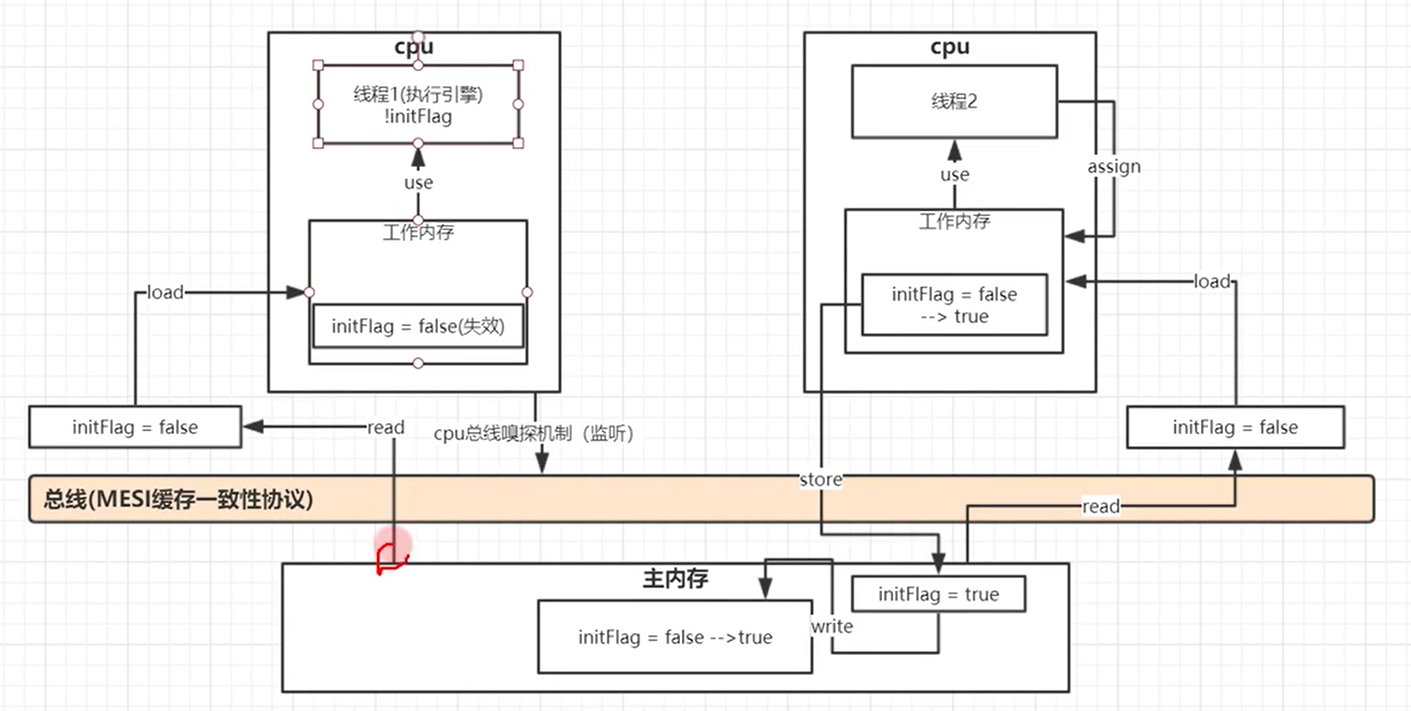 模型解释:首先线程1从主内存把数据提出来放到工作内存,然后线程对数据进行运算操作,假设线程1的运算是死循环那就会卡住在那里。这是线程2提取主内存的数据进行运算完然后放回主内存覆盖掉原来的那个数据,这个操作是需要经过总线的,volatile打开时即将覆盖在经过总线的时候就会被cpu的监听到,所有线程都会知道这个数据被更新了,旧的要失效,然后重新回主内存读取数据。