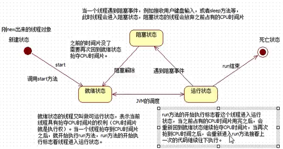 import java.lang.Thread; import java.util.Timer; import java.util.TimerTask; public class test { public static void main(String[] args) throws Exception { thread1 th=new thread1(); //定义线程 th.setName("th1"); System.out.println("即将开始"); th.start(); //启动线程 th.join(); //阻塞,合并线程 System.out.println("结束"); } } class thread1 extends Thread{ public void run(){ for (int i=0;i<=100;i++){ System.out.println("支线程"+i); } } }