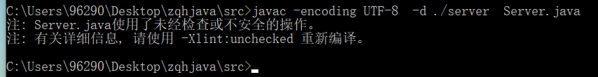 3.cmd运行先cd转换到当前的src文件夹 javac -encoding UTF-8 -d ./server Server.java 写的时候用的utf8编译也要用utf8 -d ./server指的是生成的class文件在当前目录的server文件 编译server.java文件