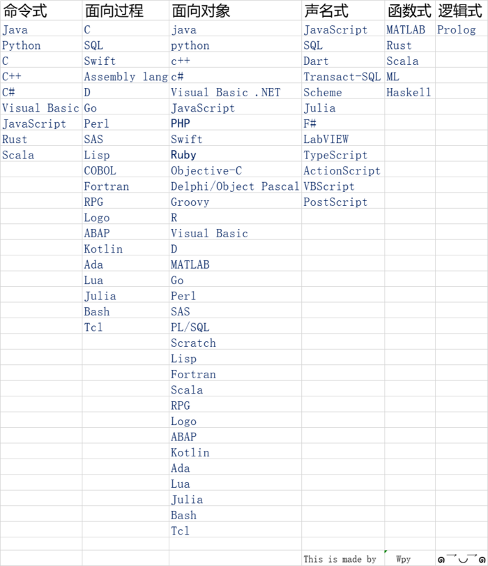 函数式:Haskell、F#、ML、Scala、lisp、logo、Scheme、R等