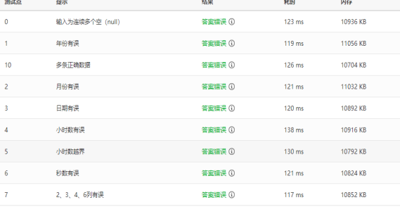 如图所示,如同玩笑一般的全部出错。很严肃的说,这就是因为个人的不严谨的行为所导致的后果,结果就是这么的残忍,一分没得,这一点无疑对心理也有着巨大的打击。不过在这一方面出现错误和其他的程序错误又存在着不同,这一处错误我们可以很清楚的知道我们出现错误的位置在哪里并且可以很快速的去解决问题。不过其中存在最大的问题还是在于其中错误的难以发现,因为我们生活之中习惯了对数字的直接处理,而在正则表达式中看中的是对字符串的每一个字符的判断,这一点就在一定程度上与我们自生的判断方式会产生不同,所以我们在对表达式进行检查的时候,经常会因为自己的思维惯性而导致自己忽略其中的错误。所以对于正则表达式的校验方面,我们必须去承认我们要绝对的注意细节问题。因为这几道题确实给予了我特别大的冲击,所以可能对细节这一点的强调要更多一些。