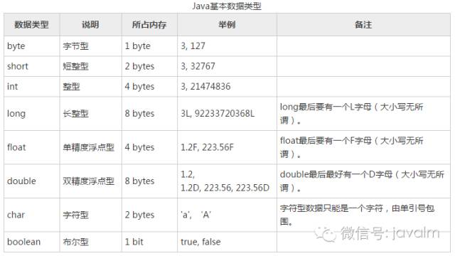 Java中共有8种基本数据类型,包括4 种整型、2 种浮点型、1 种字符型、1 种布尔型,请见下表。