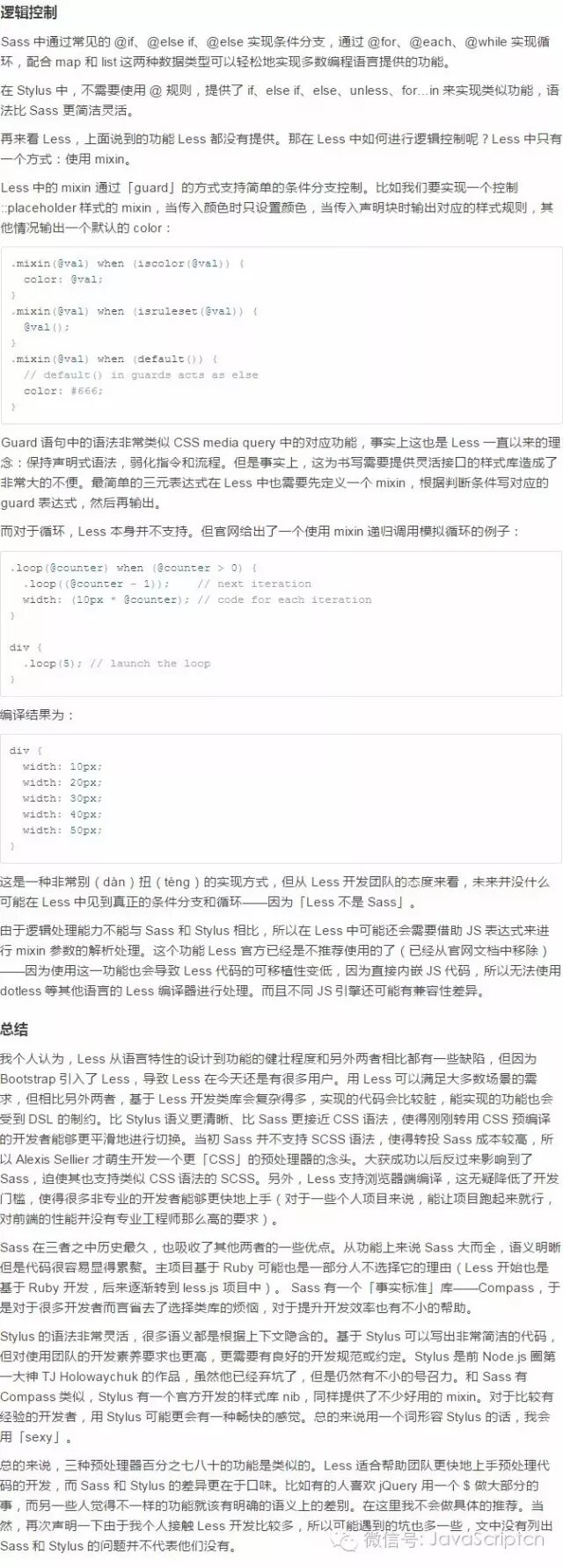 关于函数,真正的区别在于:Sass 和 Stylus 都支持用 DSL 直接添加自定义函数,而 Less 中如果要添加自定义函数必须通过使用插件(2.0.0 以后的版本才支持插件)。这决定了用 Sass 和 Stylus 书写的代码可移植性更高,不需要编译环境有插件即可运行,而 Less 则需要额外添加编译时的依赖。