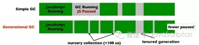 和其他语言一样,javascript的GC策略也无法避免一个问题:GC时,停止响应其他操作,这是为了安全考虑。而Javascript的GC在100ms甚至以上,对一般的应用还好,但对于JS游戏,动画对连贯性要求比较高的应用,就麻烦了。这就是新引擎需要优化的点:避免GC造成的长时间停止响应。