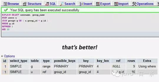 EXPLAIN 的查询结果还会告诉你你的索引主键被如何利用的,你的数据表是如何被搜索和排序的……等等,等等。