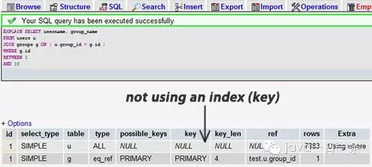 挑一个你的SELECT语句(推荐挑选那个最复杂的,有多表联接的),把关键字EXPLAIN加到前面。你可以使用phpmyadmin来做这个事。然后,你会看到一张表格。下面的这个示例中,我们忘记加上了group_id索引,并且有表联接: