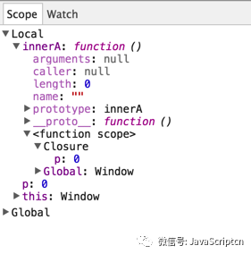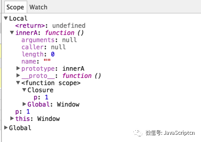 console.log(p); //对外部闭包域的私有变量进行了引用,故 innerA 对象的 function scope 会产生一个名为 closure 的对象属性,closure 对象内含有一个名为 p 的引用