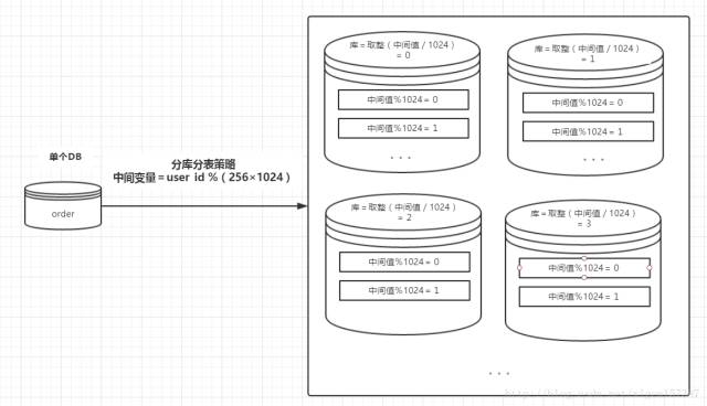 1、中间变量 = user_id%(库数量*每个库的表数量);