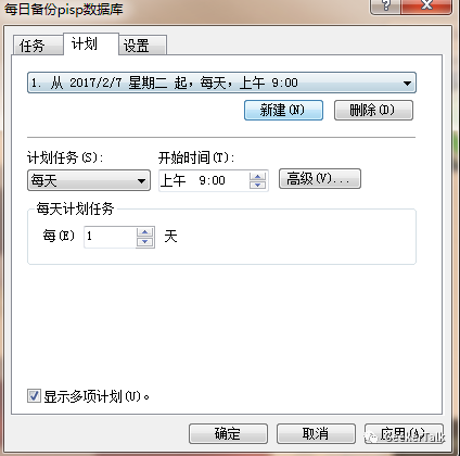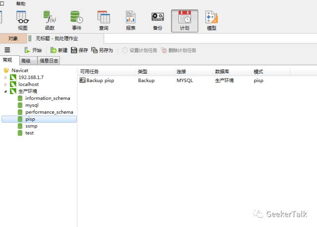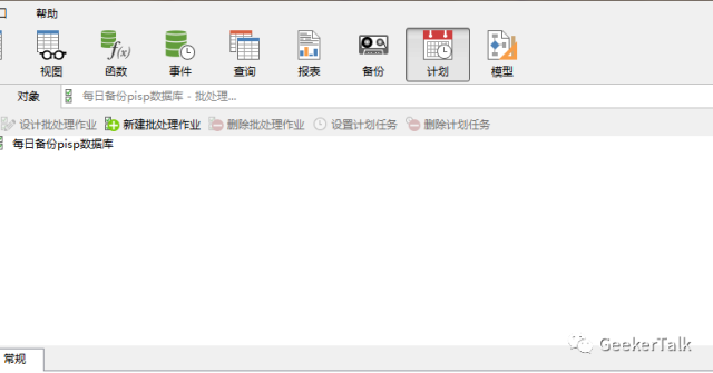 选中【计划】菜单,在左边选中要备份的数据库pisp,右边就默认显示一个备份数据库的可用任务。