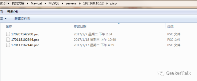D:\我的文档\Navicat\MySQL\servers\192.168.10.12\pisp目录中(视自己的机器软件安装目录而定)