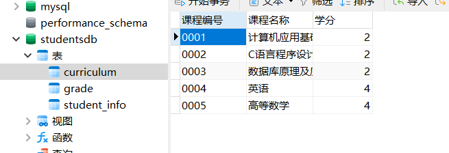 4.使用SQL语句INSERT向studentsdb数据库的student_info、curriculum、grade表插入数据