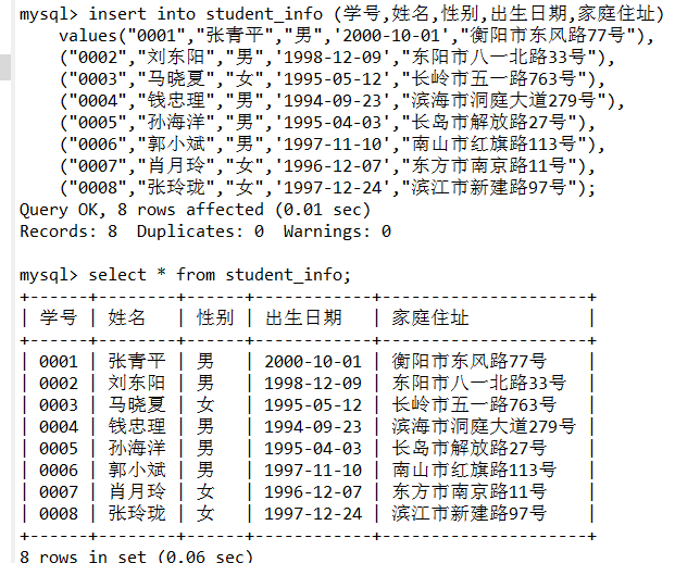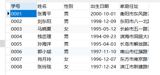 values("0001","张青平","男",'2000-10-01',"衡阳市东风路77号"),