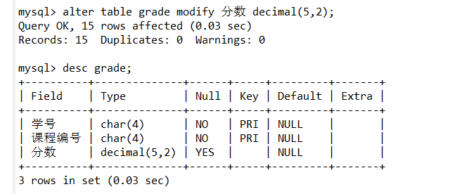 alter table grade modify 分数 decimal(5,2);