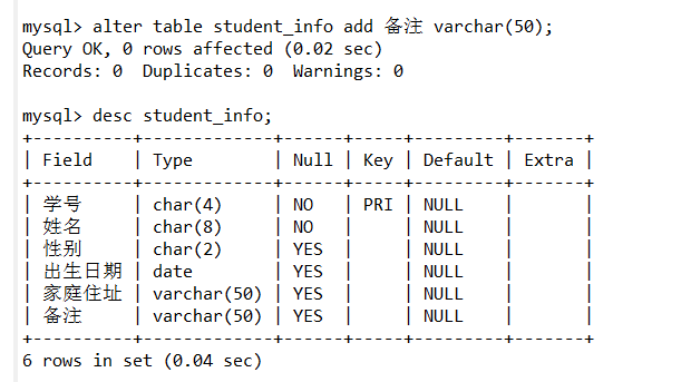 alter table student_info add 备注 varchar(50);