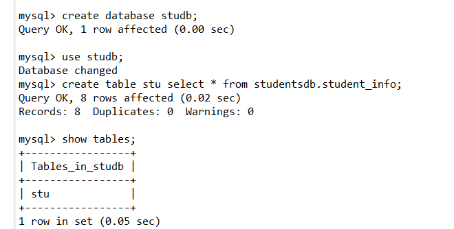 create table stu select * from studentsdb.student_info;