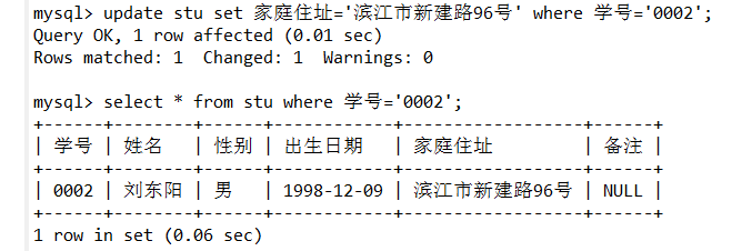 update stu set 家庭住址='滨江市新建路96号' where 学号='0002';