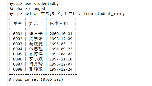 8.在studentsdb数据库中使用SELECT语句进行基本查询。