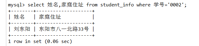select 姓名,家庭住址 from student_info where 学号='0002';