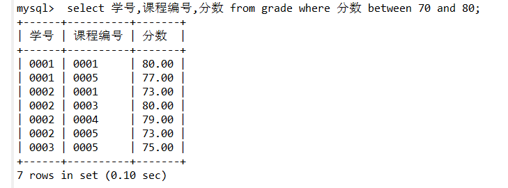 select 学号,课程编号,分数 from grade where 分数 between 70 and 80;